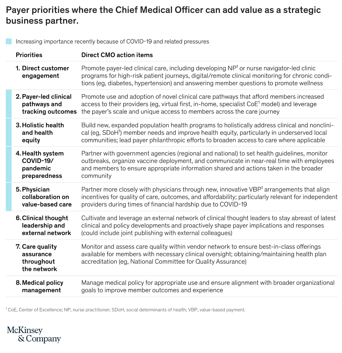 While the specific strategy and market context of each payer will dictate relative prioritization across these items, all remain important for the CMO to consider on behalf of the organization. Taken collectively, these strategic priorities impact the majority of payer value creation levers (for example, medical cost reduction through VBP and policy, revenue yield from clinical acquisitions, growth/retention from virtual first products) and all have one thing in common: clinical leadership is a differentiating factor for success. As such, payers who are quick to embrace the expanded priorities of the CMO as a strategic thought partner will achieve tangible bottom-line impact in the near term and build competitive differentiation in the long term.